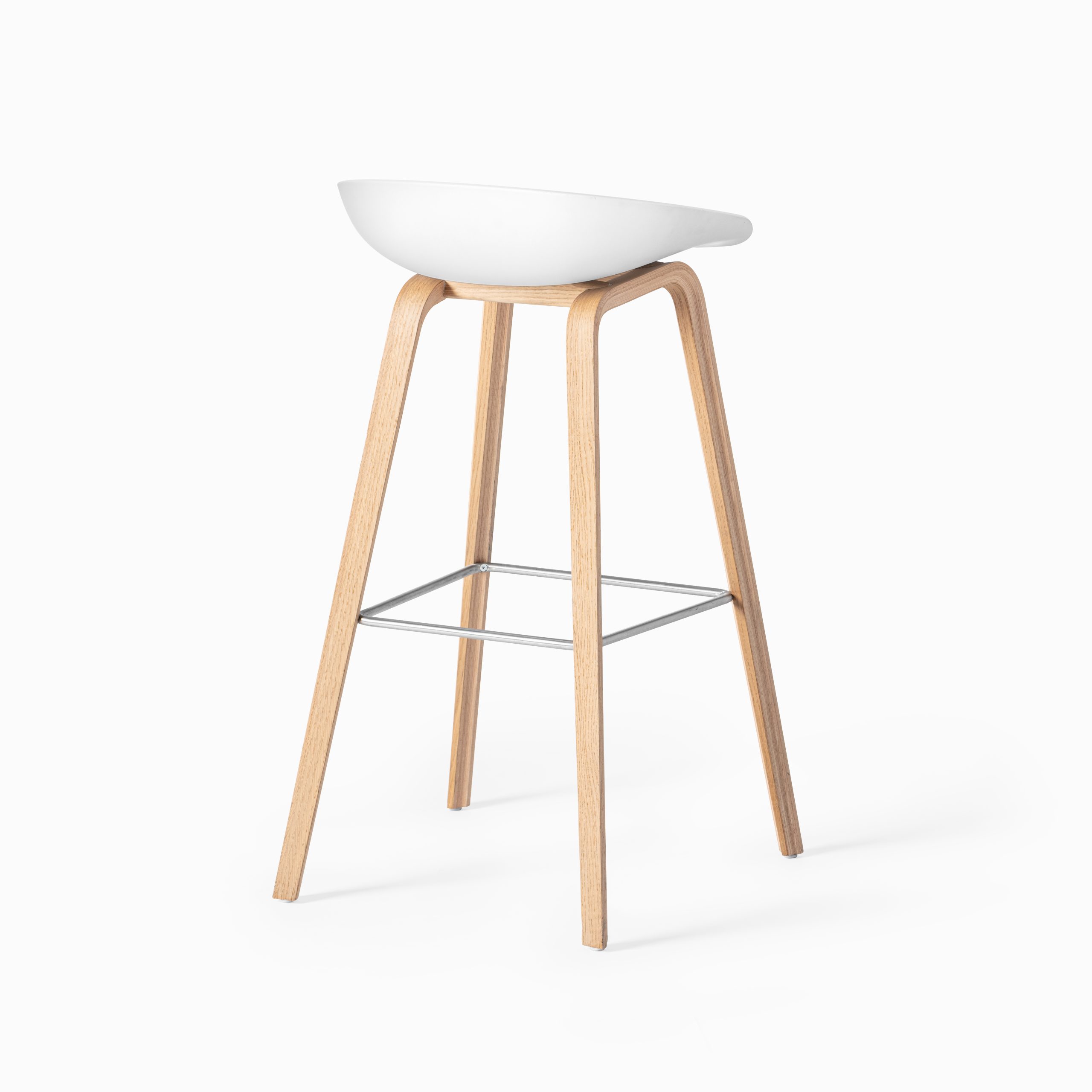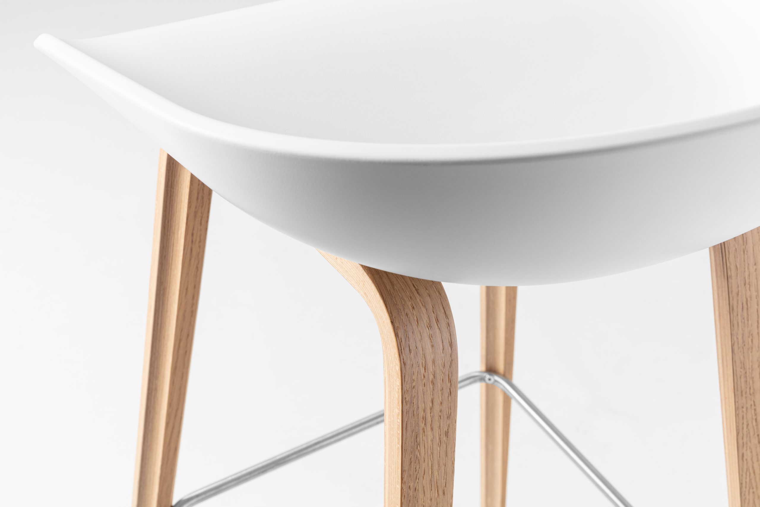 „About a Stool“, Sitzschale aus Polypropylen weiß, Holzgestell aus Multiplex Birke, Eiche furniert