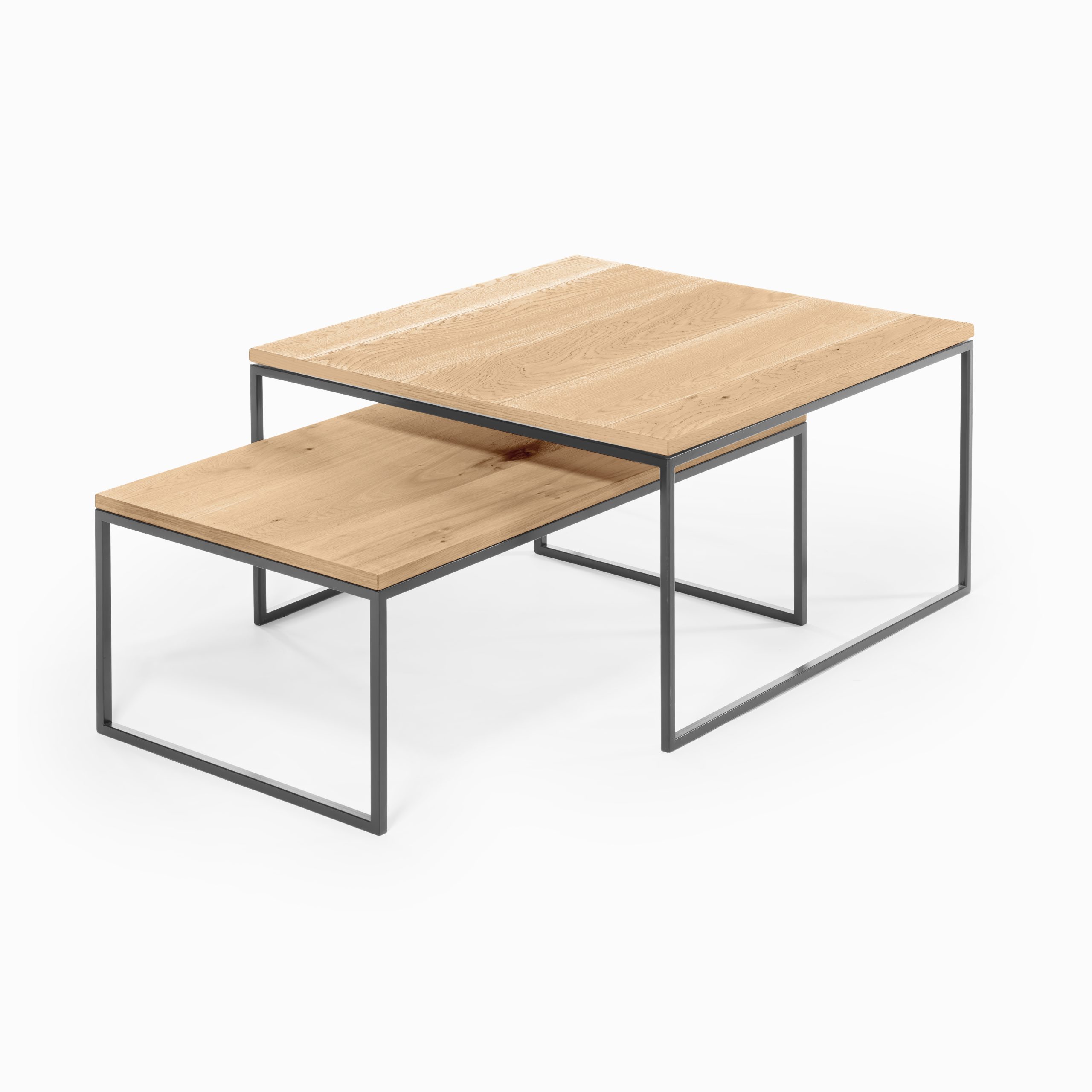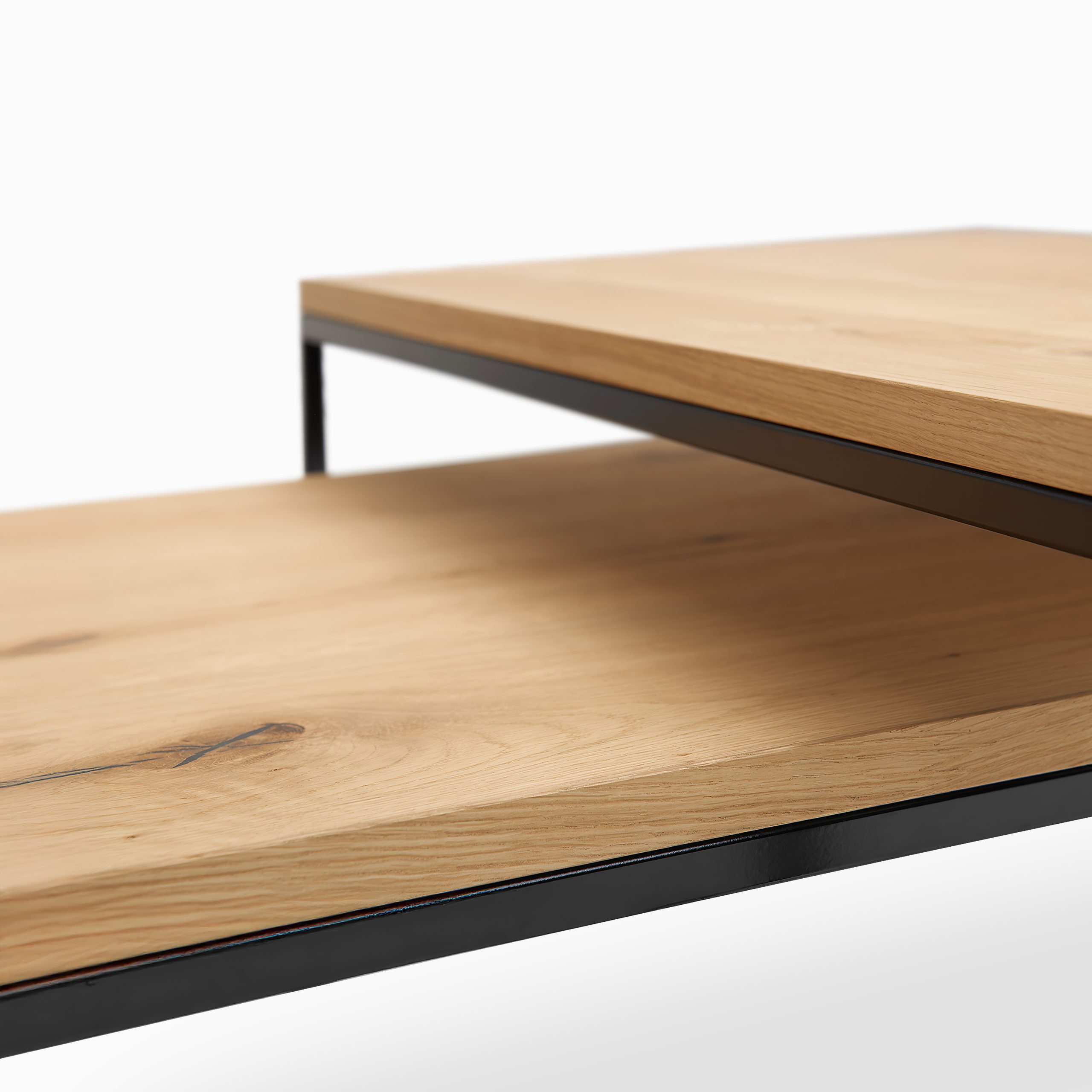 Tischplatte in Echtholz, Eiche astig, Untergestell in Stahl, matt schwarz lackiert