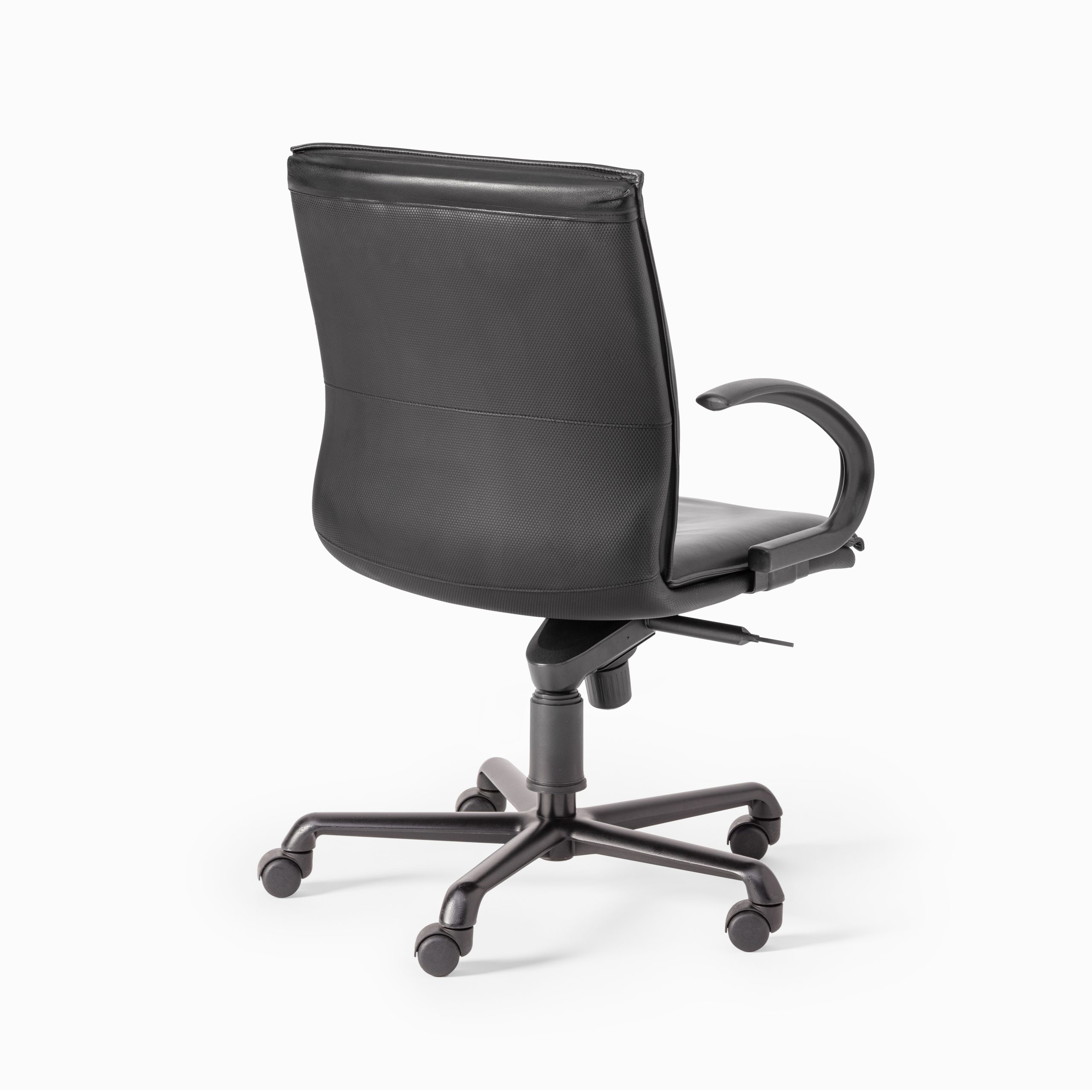 Sitzfläche in Leder schwarz, gepolstert, Gestell in Stahlrohr verchromt, rollbar, höhenverstellbar, mit Armlehnen