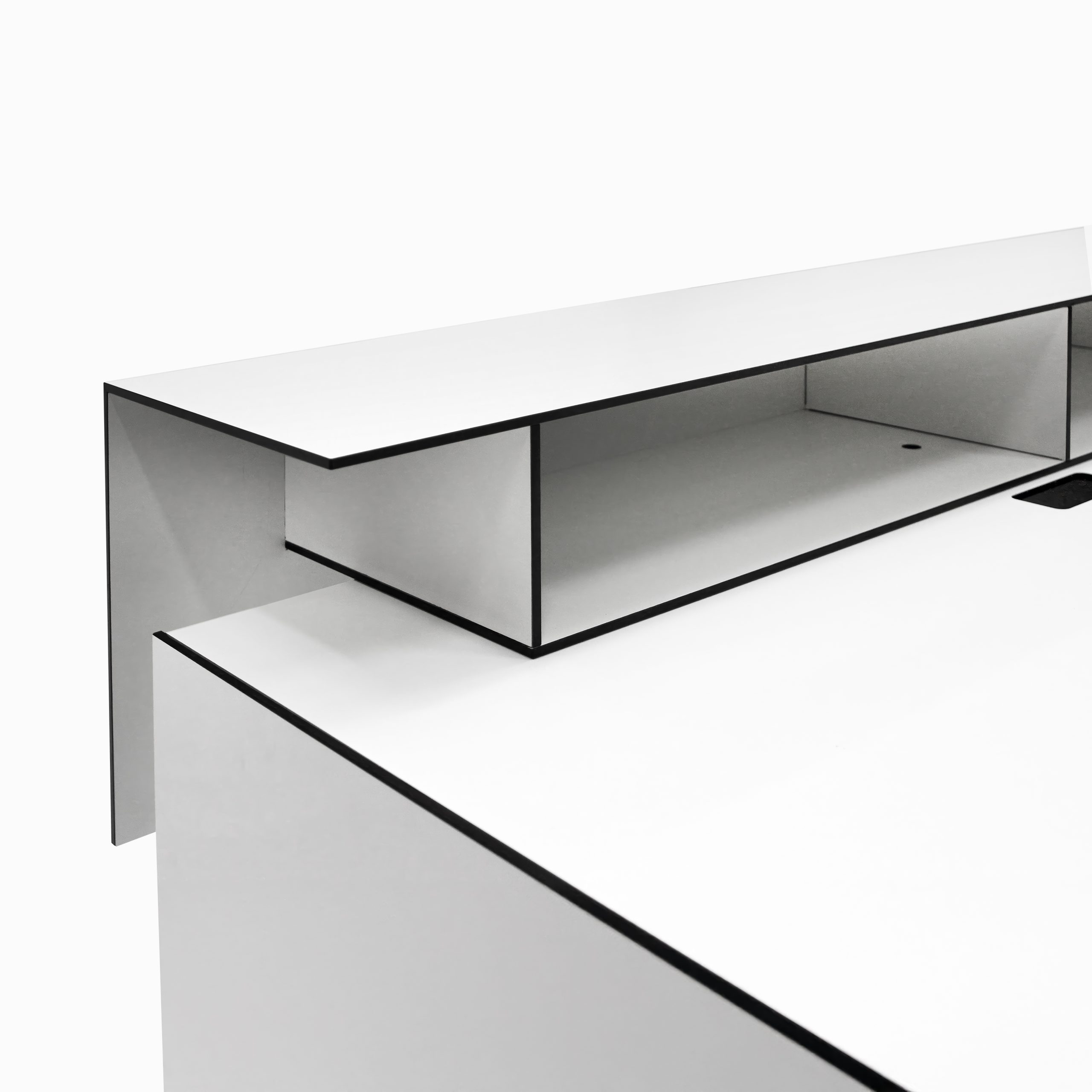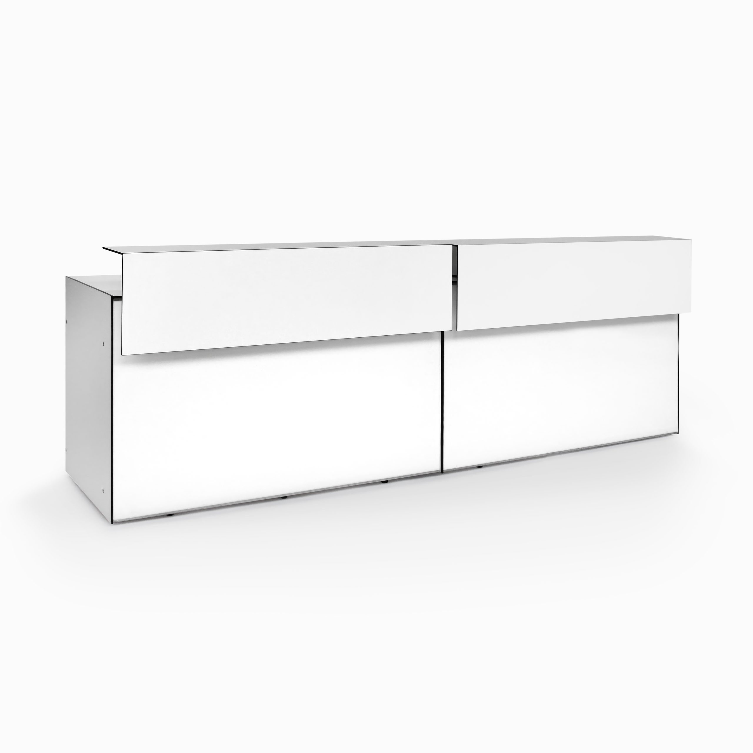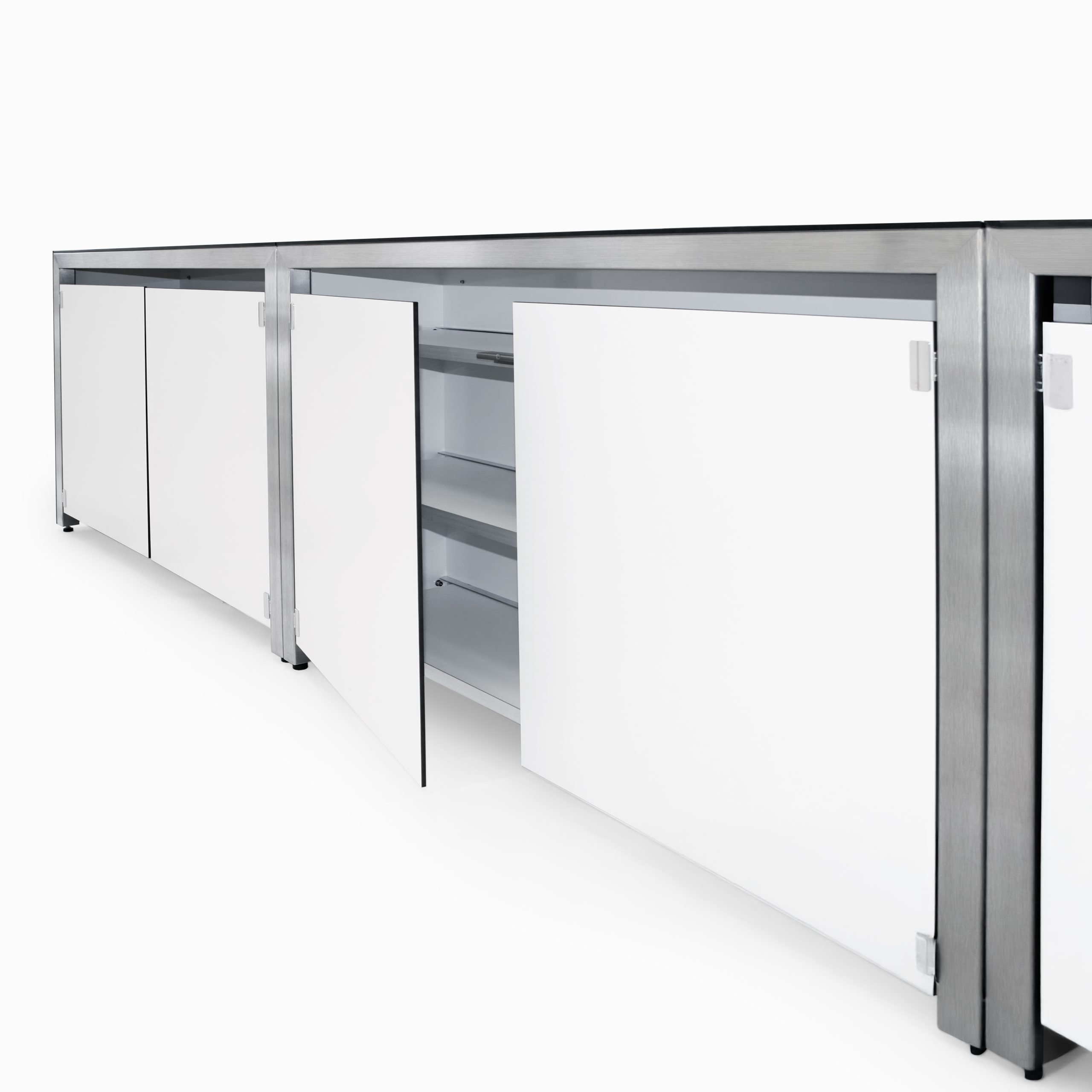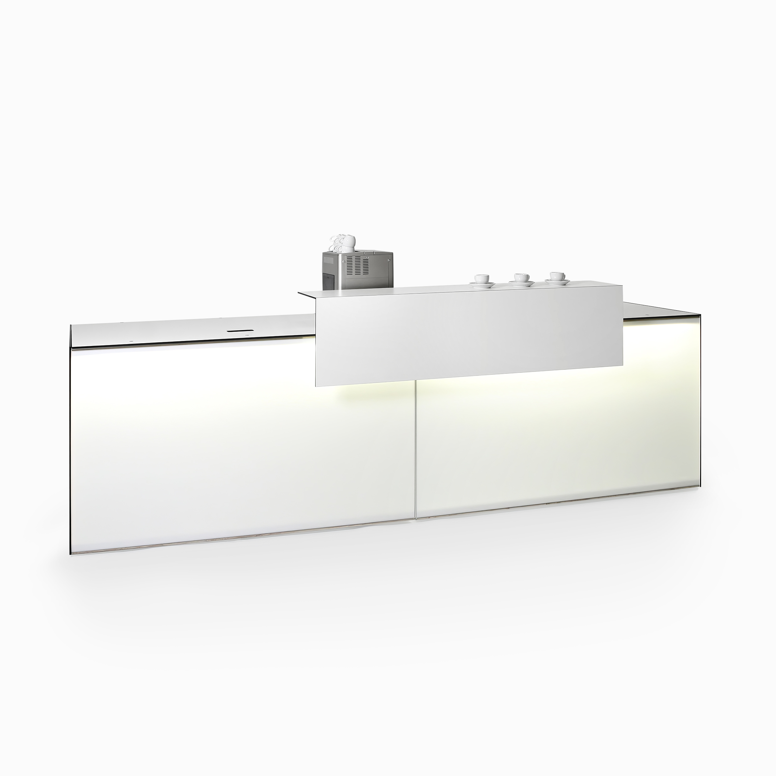 Front in Acrylglas, mit RGB LEDs hinterleuchtbar, Arbeitsfläche und Seiten in Kompaktplatte weiß, Korpus in Aluminium pulverbeschichtet, weiß, inklusive Fachböden, Kabelführung möglich, optional mit Drehtüren, inkl. passendem Aufsatz, weiß, mit Stauraum rückseitig