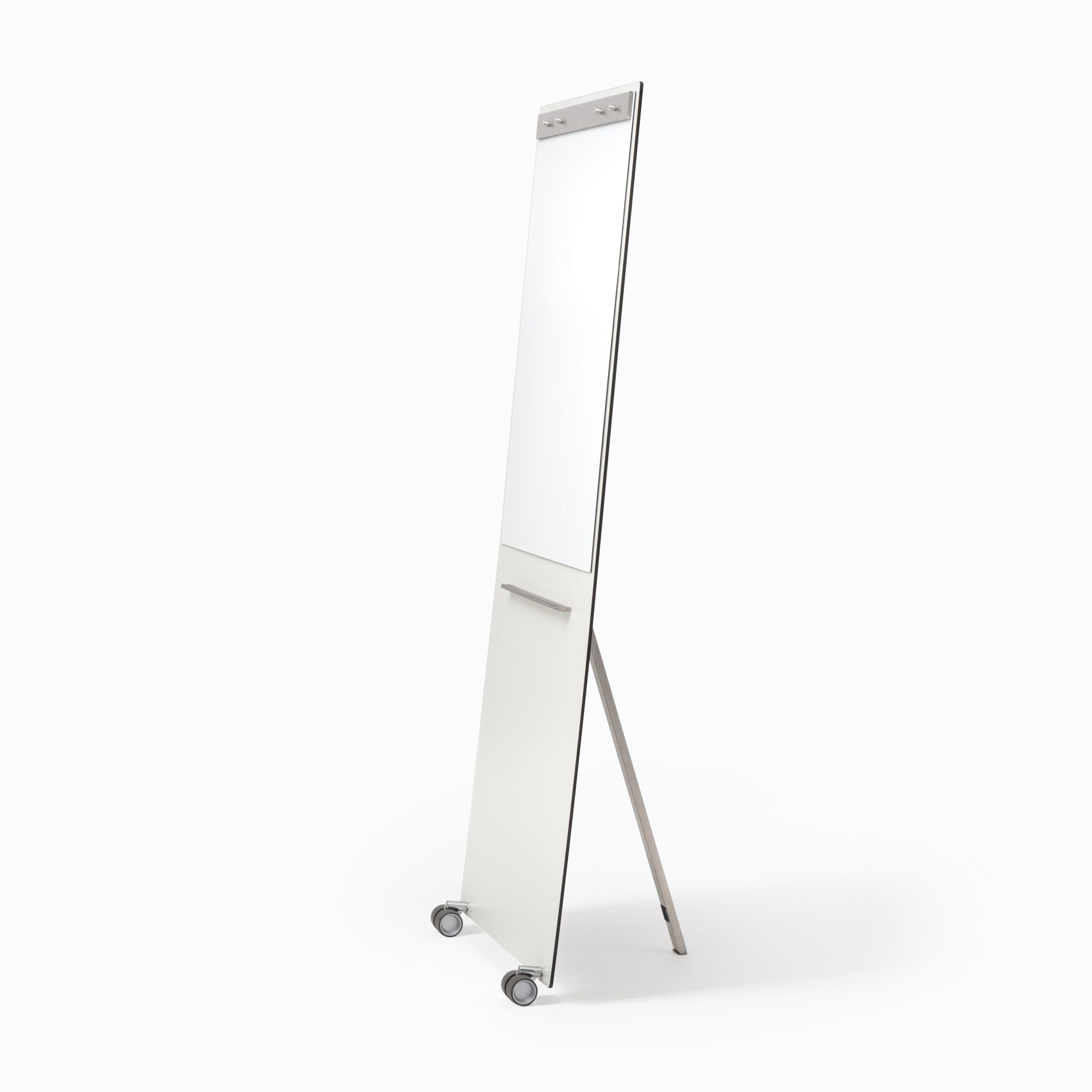 Schreibplatte in Kompaktplatte weiß, Kern dunkel, Stiftablage und rückseitige Stütze in Edelstahl, Rollen in grau, inkl. Arbeitsblock 97,5 x 65 cm, inkl. Whiteboard 102 x 71 cm