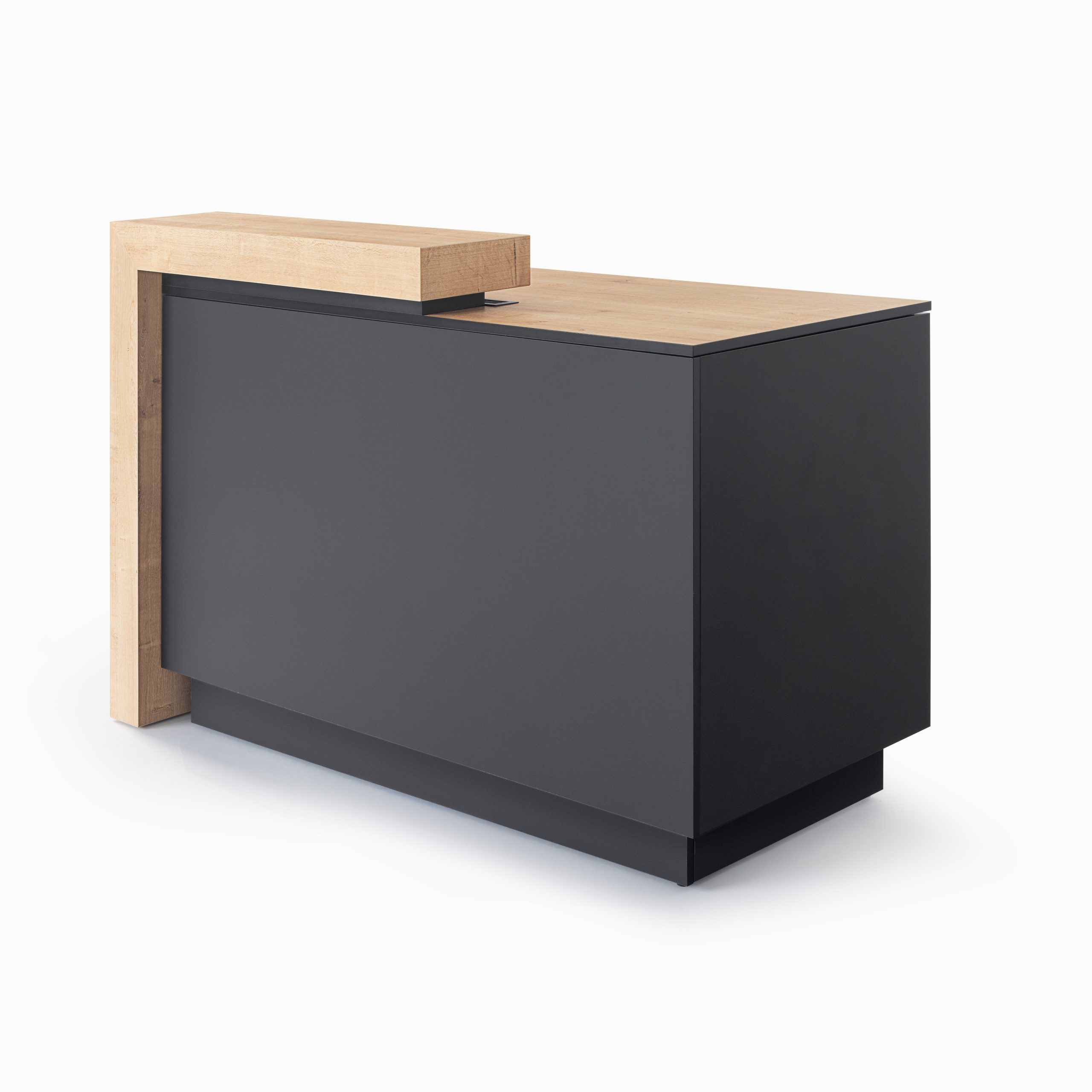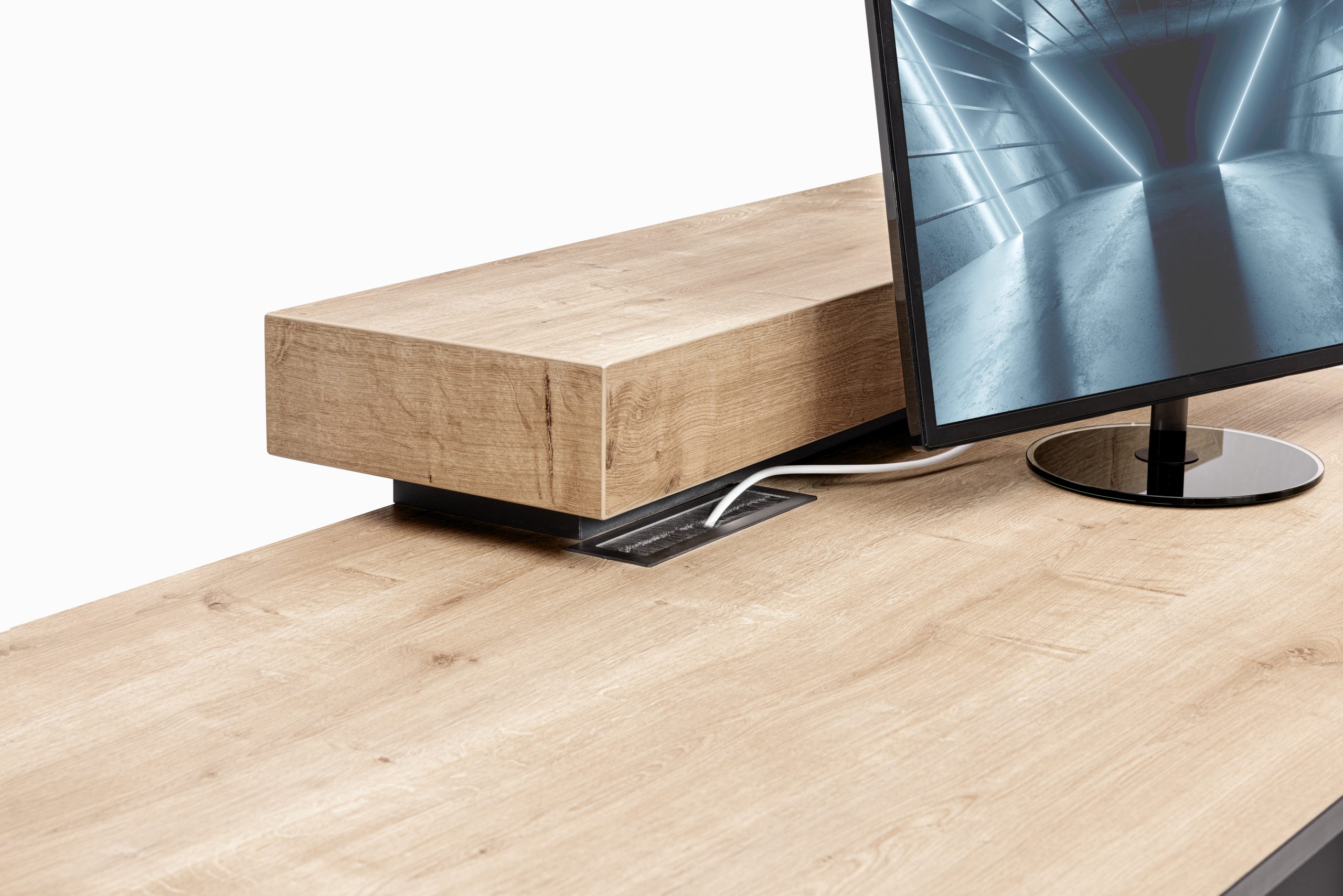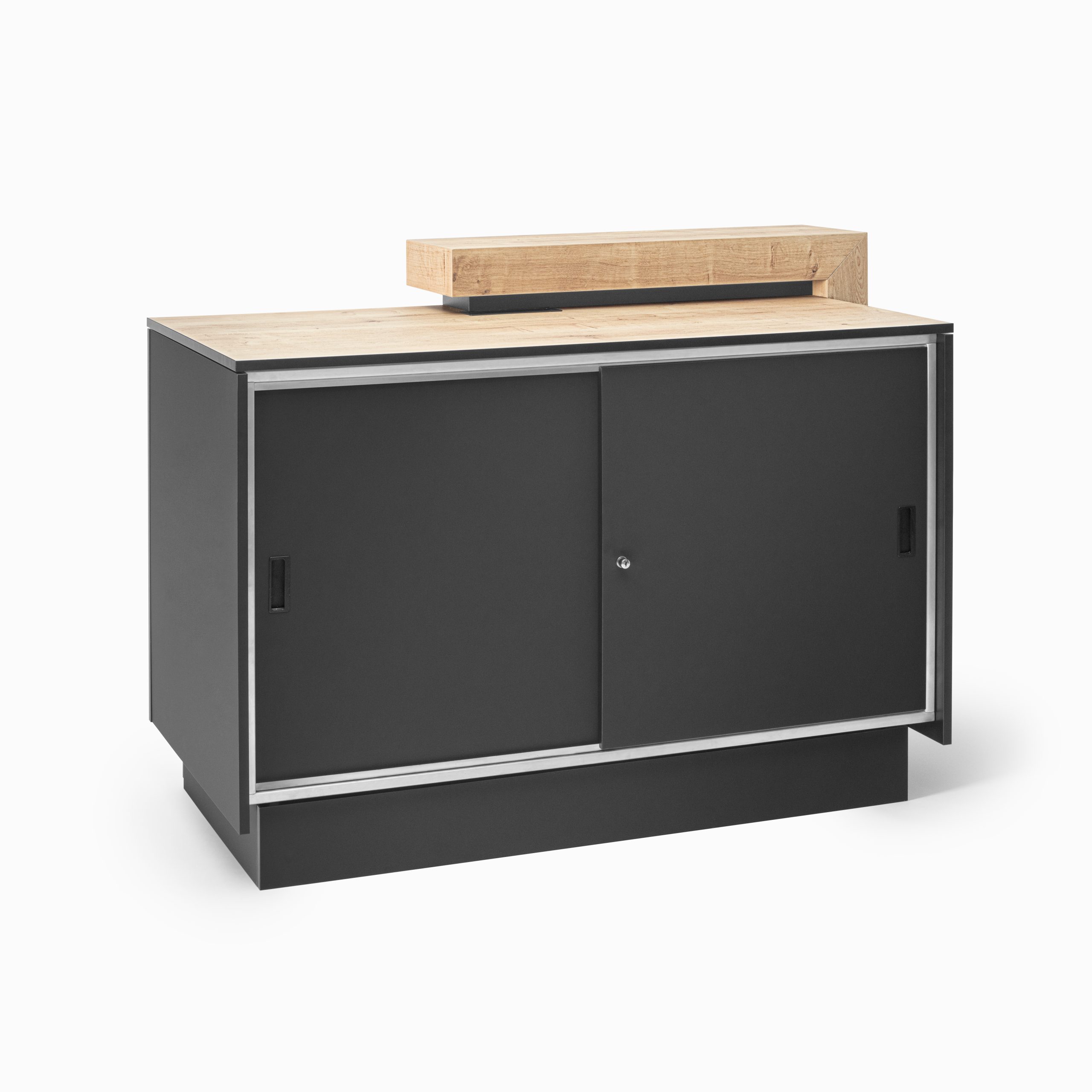 Verblendung in Piton „anti fingerprint“, matt schwarz, Arbeitsplatte und Aufsatz in Eiche-Optik, Korpus aus Edelstahl, rückseitig Schiebetür abschließbar, inklusive Fachböden in schwarz, Kabelführung möglich