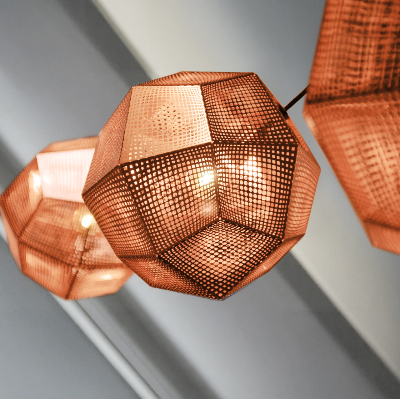 „Etch Shade Copper“, Tom Dixon Lampenschirm aus perforiertem Kupfer-Blech, Aufhängung textil schwarz Kabellänge 250 cm, Halogen 1x 46W, warmweiß, 2700K