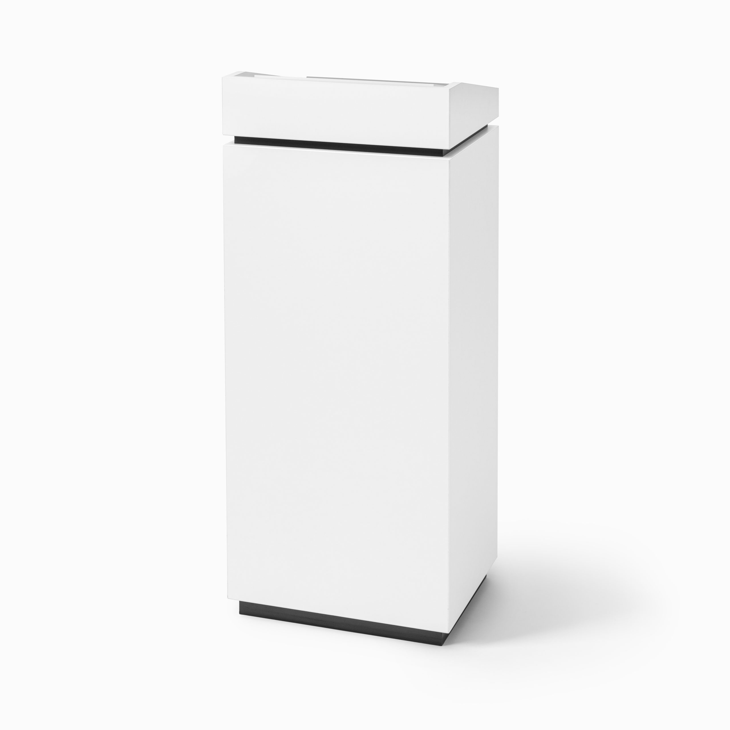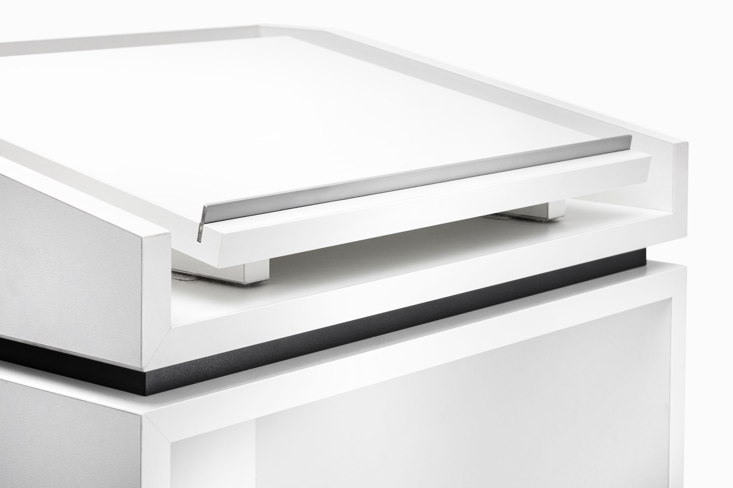 Korpus aus Holzwerkstoff melaminharzbeschichtet, weiß, Sockel und Schattenfuge schwarz, verdeckte Kabelführung für Mikrofon o.ä. möglich, zusätzliches Ablagefach