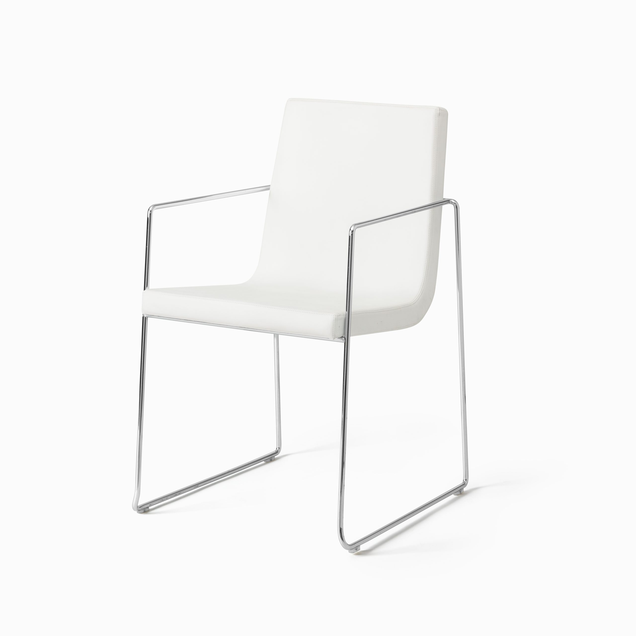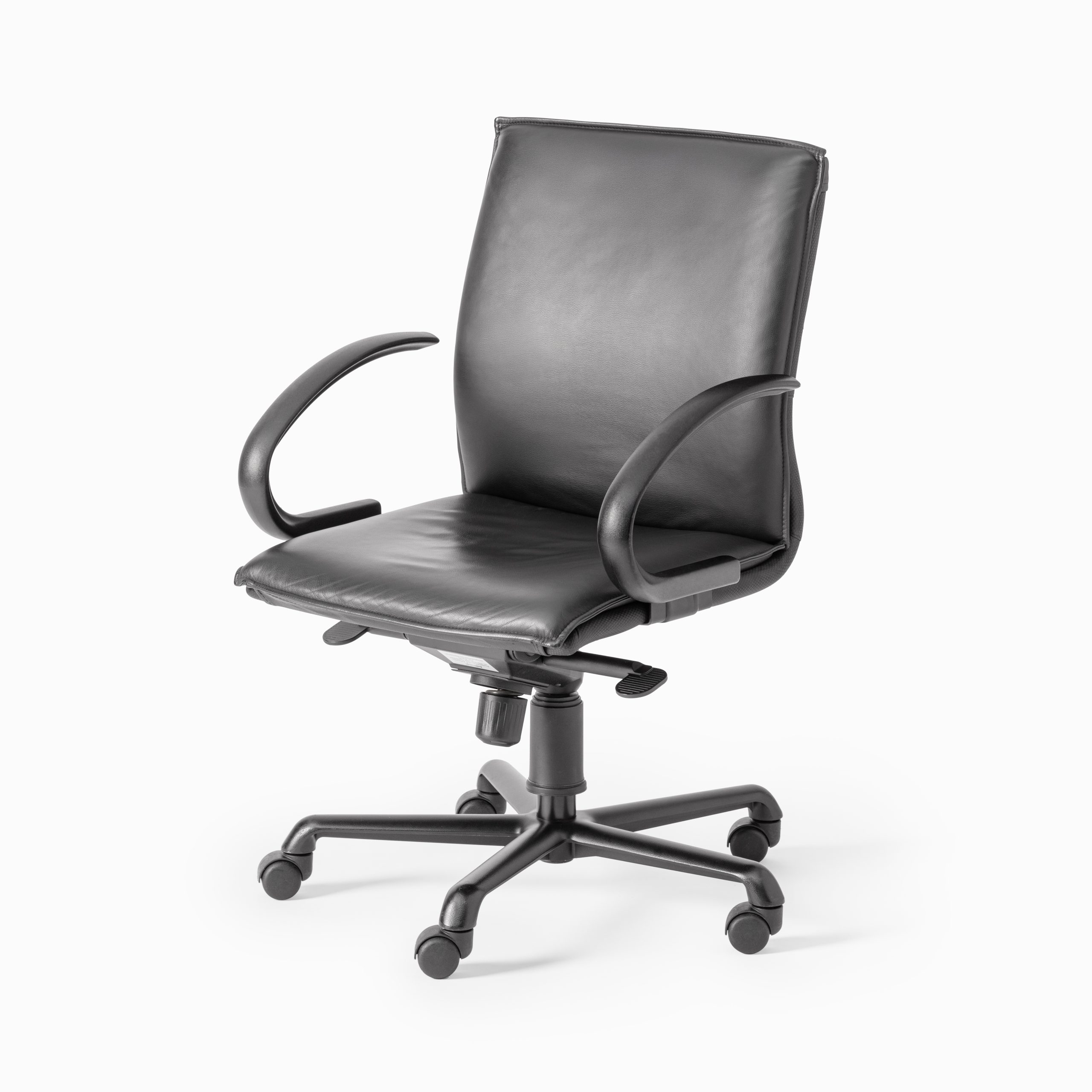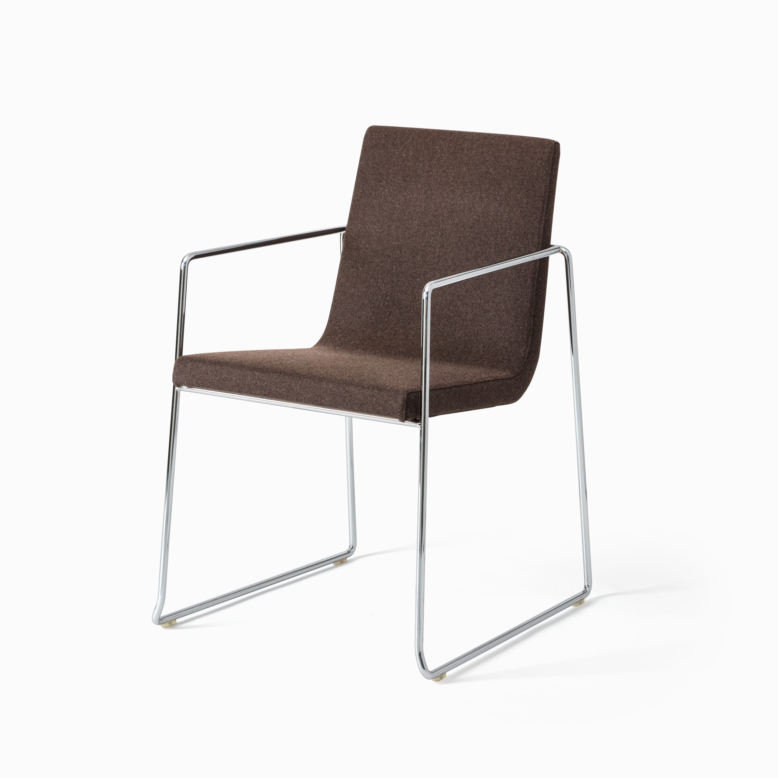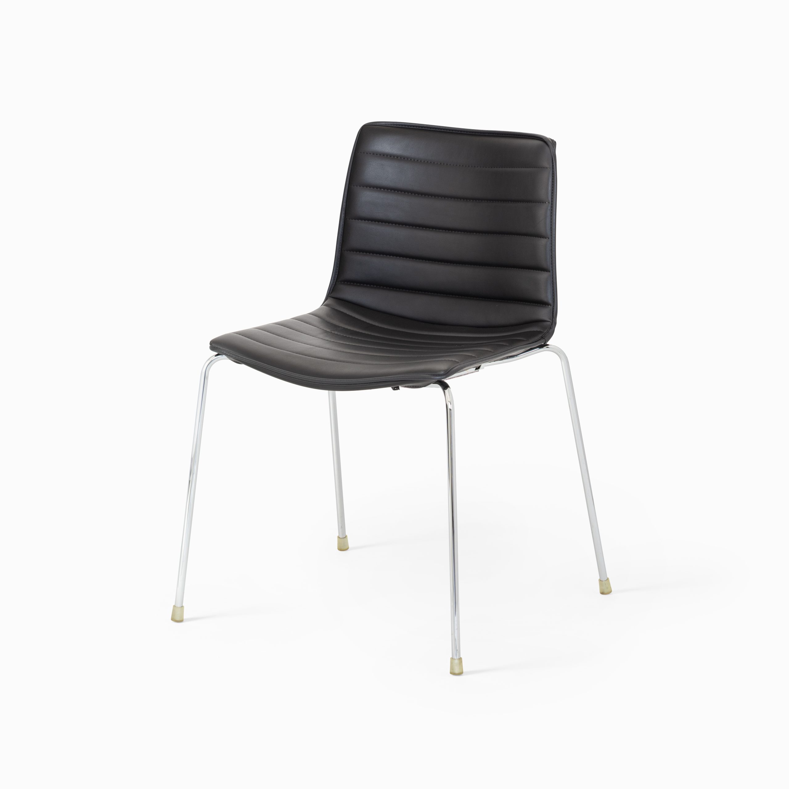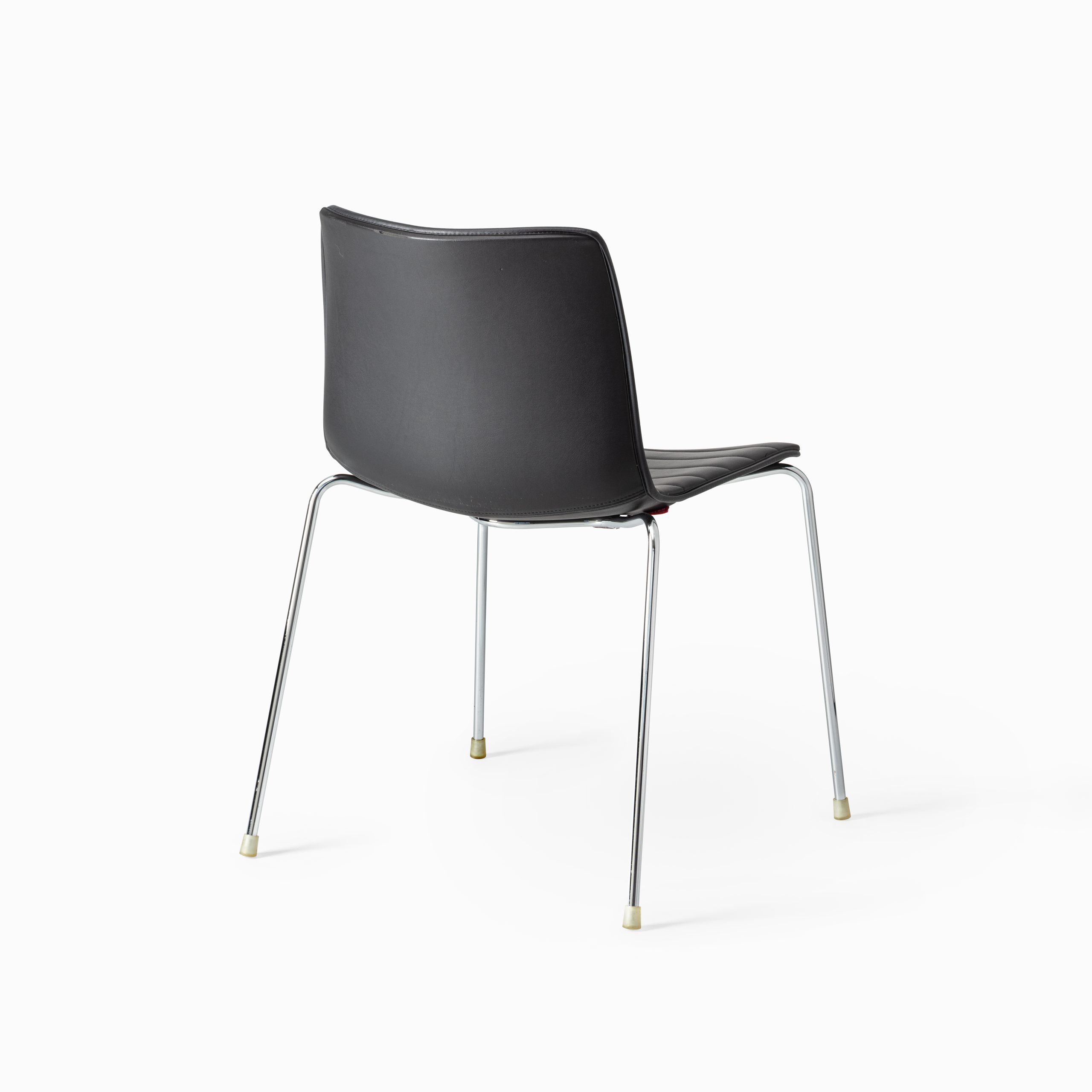 „Catifa“, Sitzschale Leder gepolstert, schwarz, Steppnähte querlaufend, Gestell in Stahlrohr verchromt, stapelbar